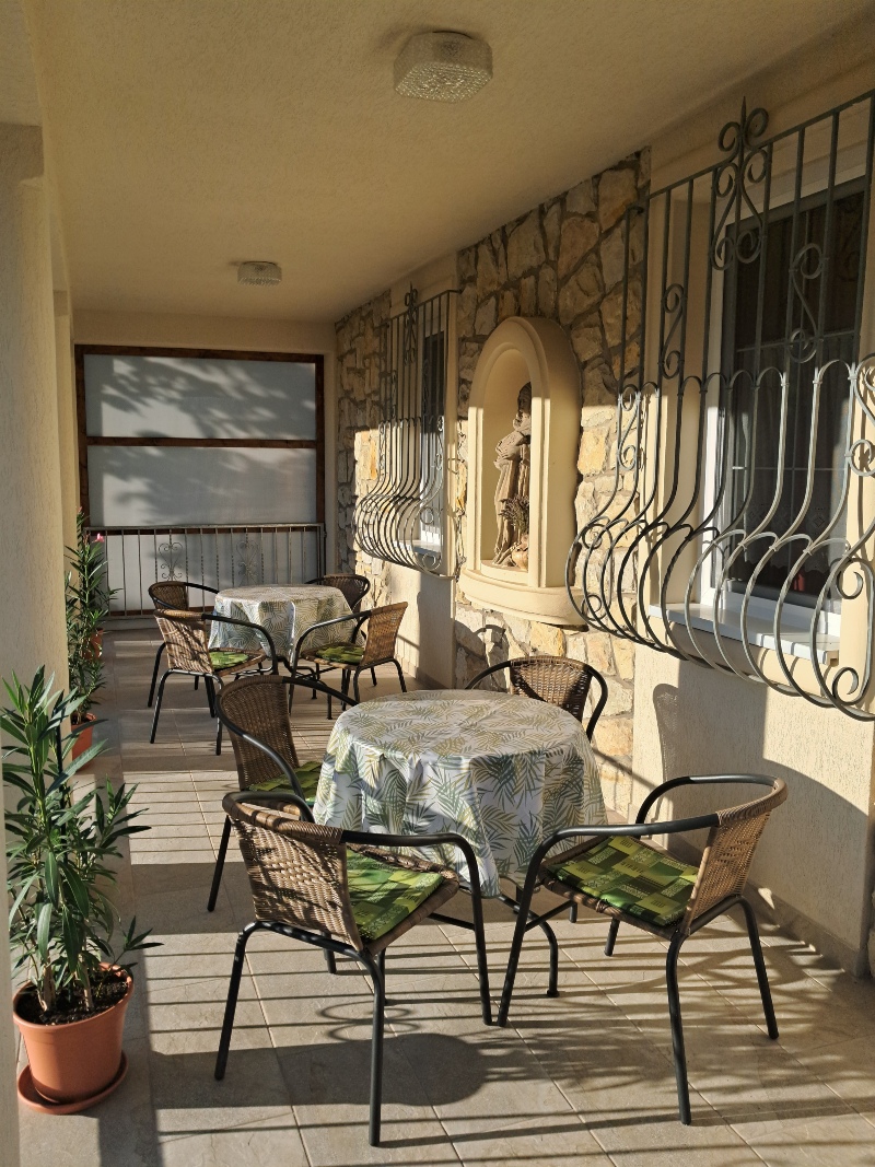 A hangulatos terasz alkalmas a közös étkezésekhez vagy akár beszélgetésekhez, borozgatásokhoz.